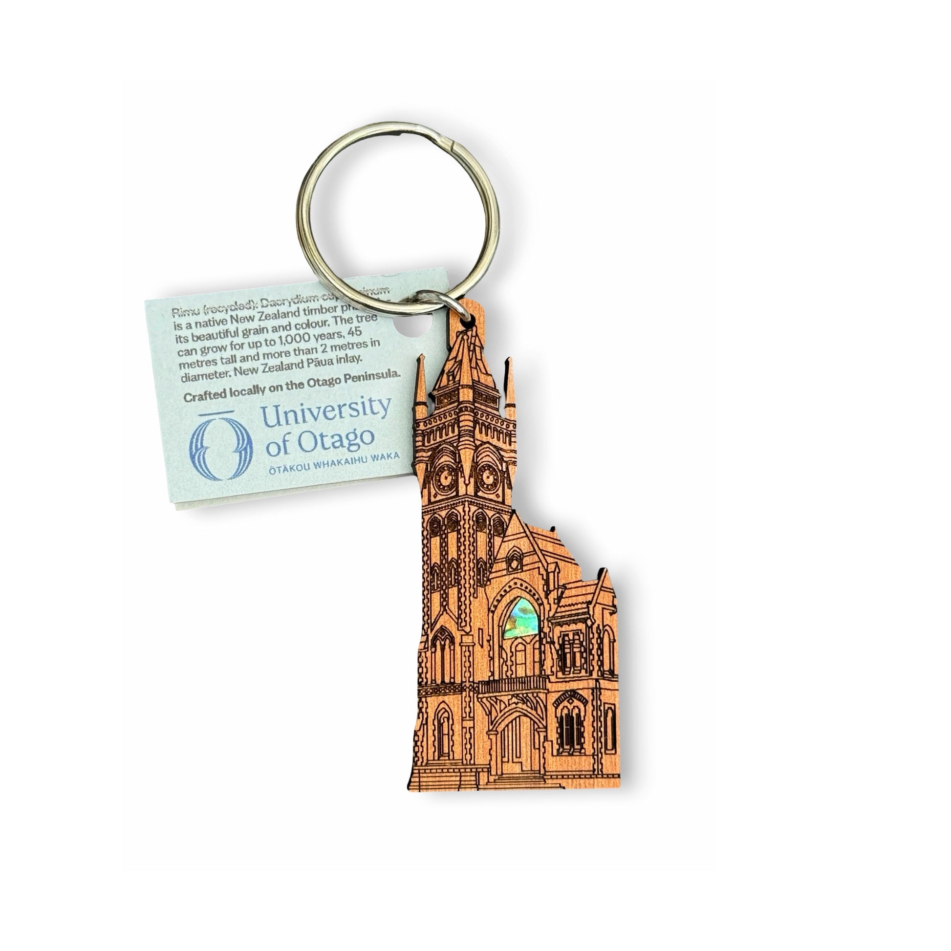 Made in Dunedin, the iconic University of Otago Clocktower has been finely laser-cut onto recycled rimu (a native New Zealand timber) with paua inlay, to create this decorative key ring.
