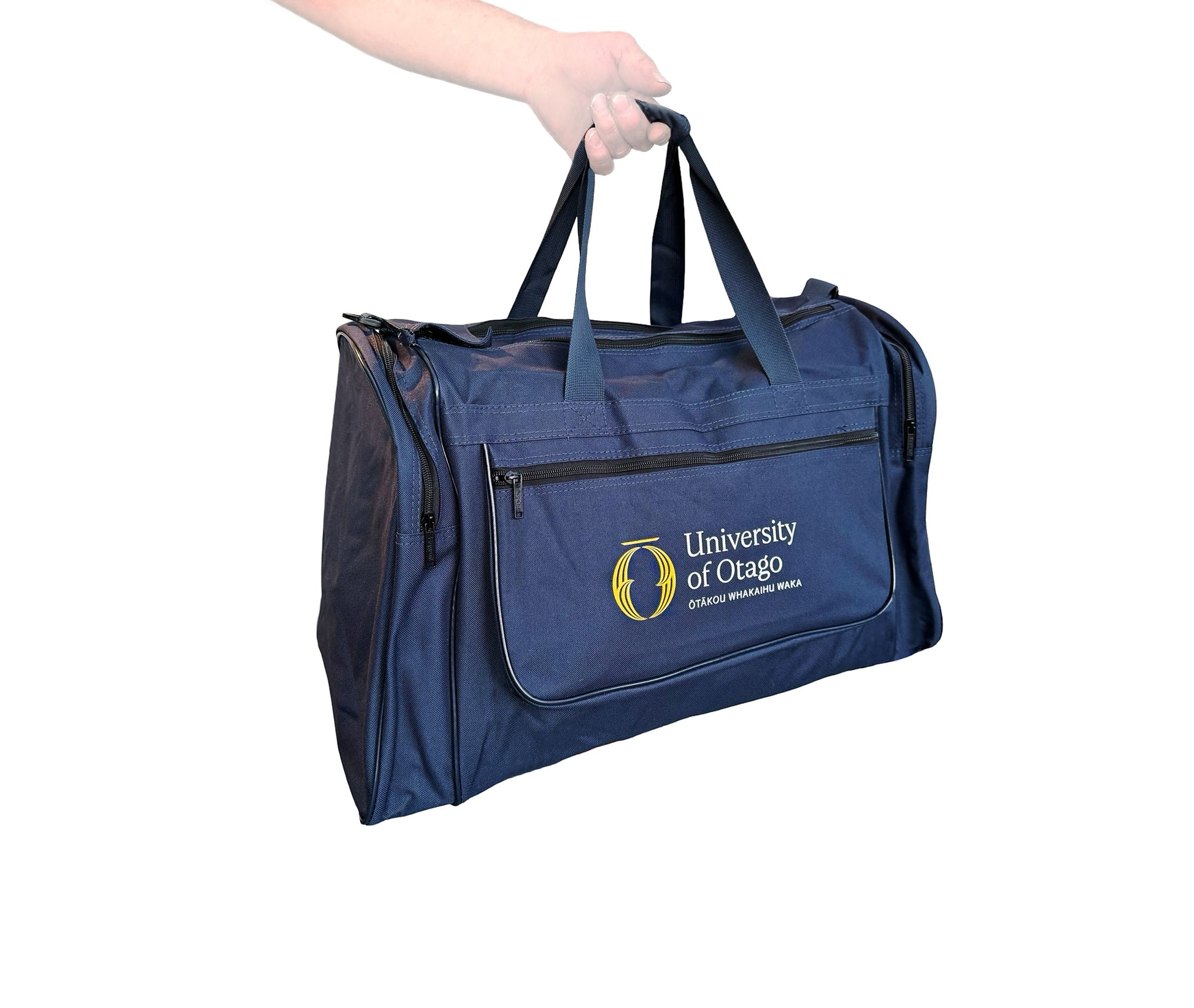 This sports bag features the University of Otago's new tohu (symbol) and its new ikoa Māori (Māori name) on the front, and is designed for durability with reinforced stitching on the shoulder straps and handles.